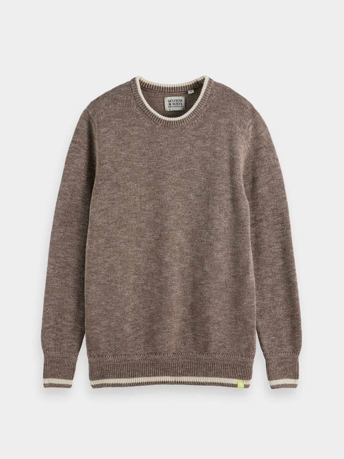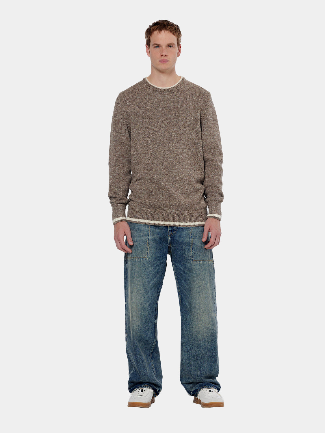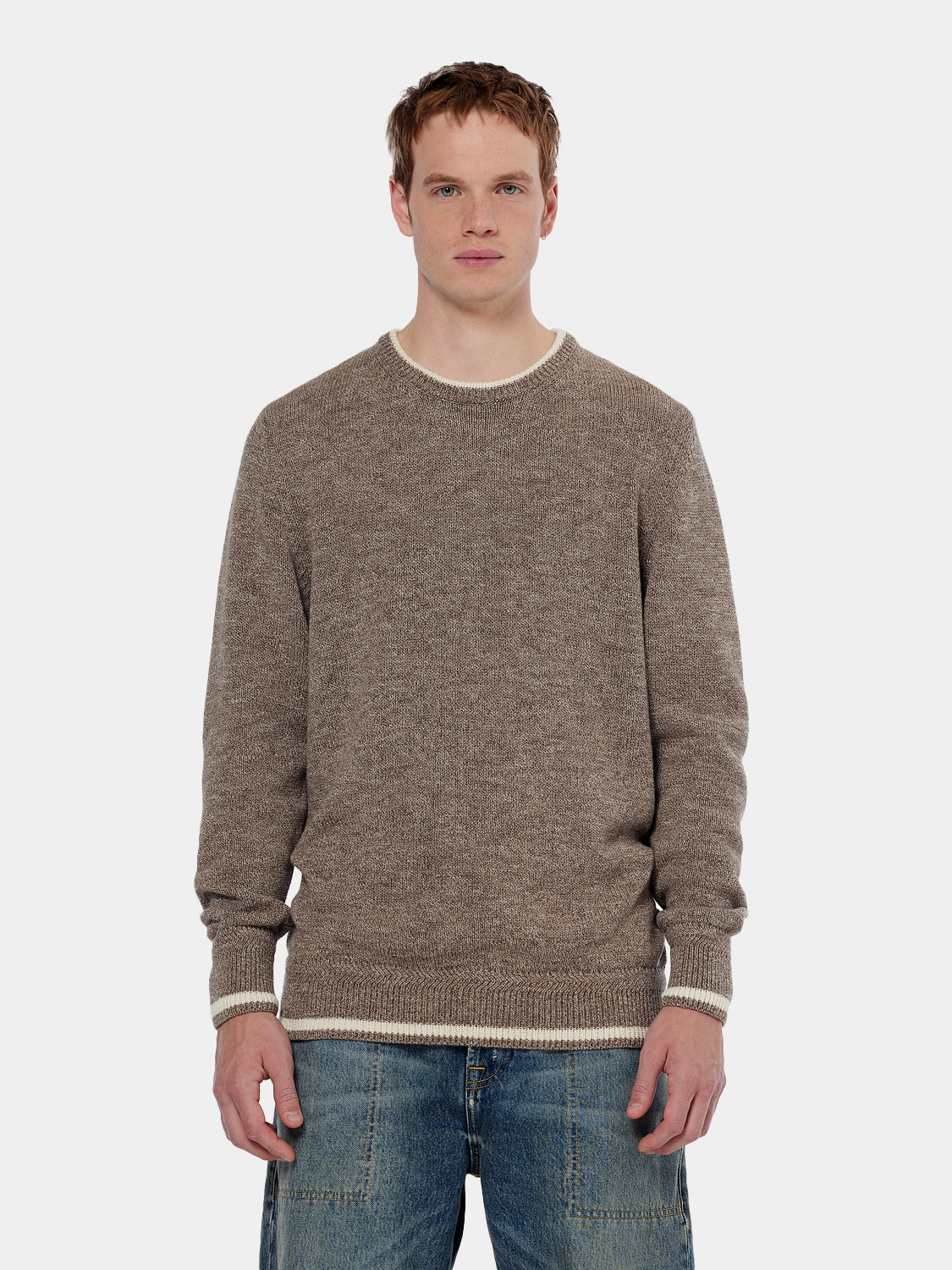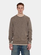 This pullover features a melange fabric that adds depth and character to the classic crewneck design. Detailed with rib knit cuffs and bottom, and a subtle stripe detail along the collar, bottom, and sleeves, it's a timeless piece for any occasion.