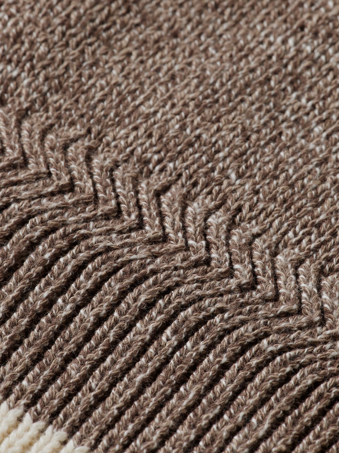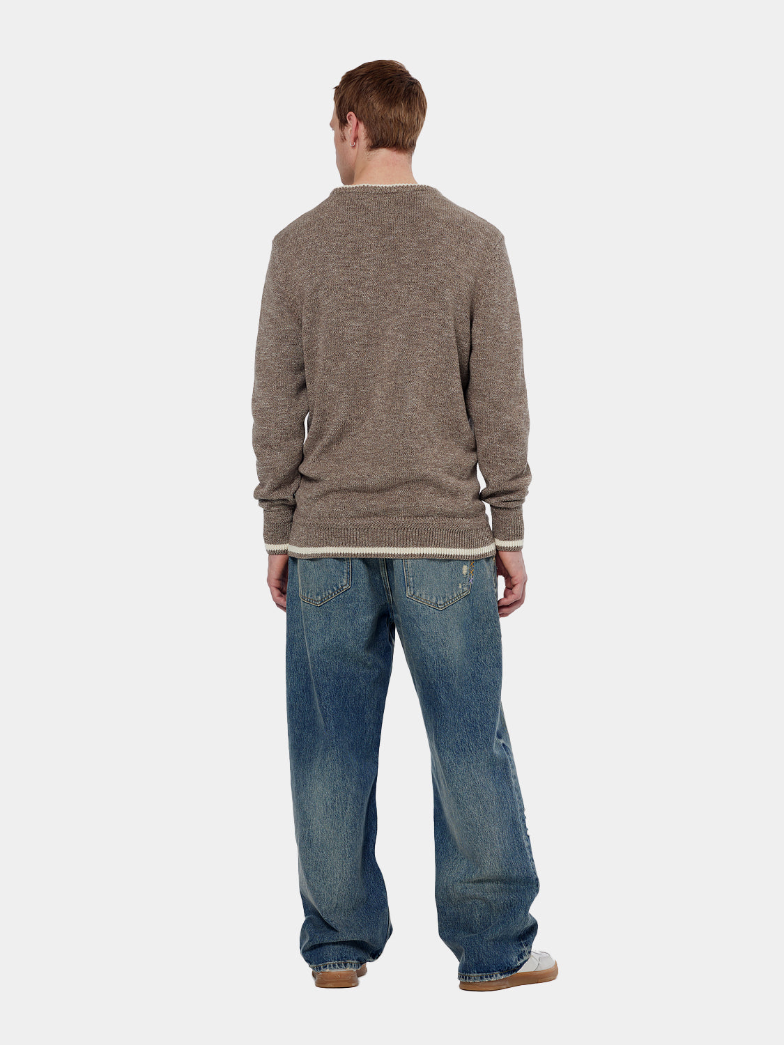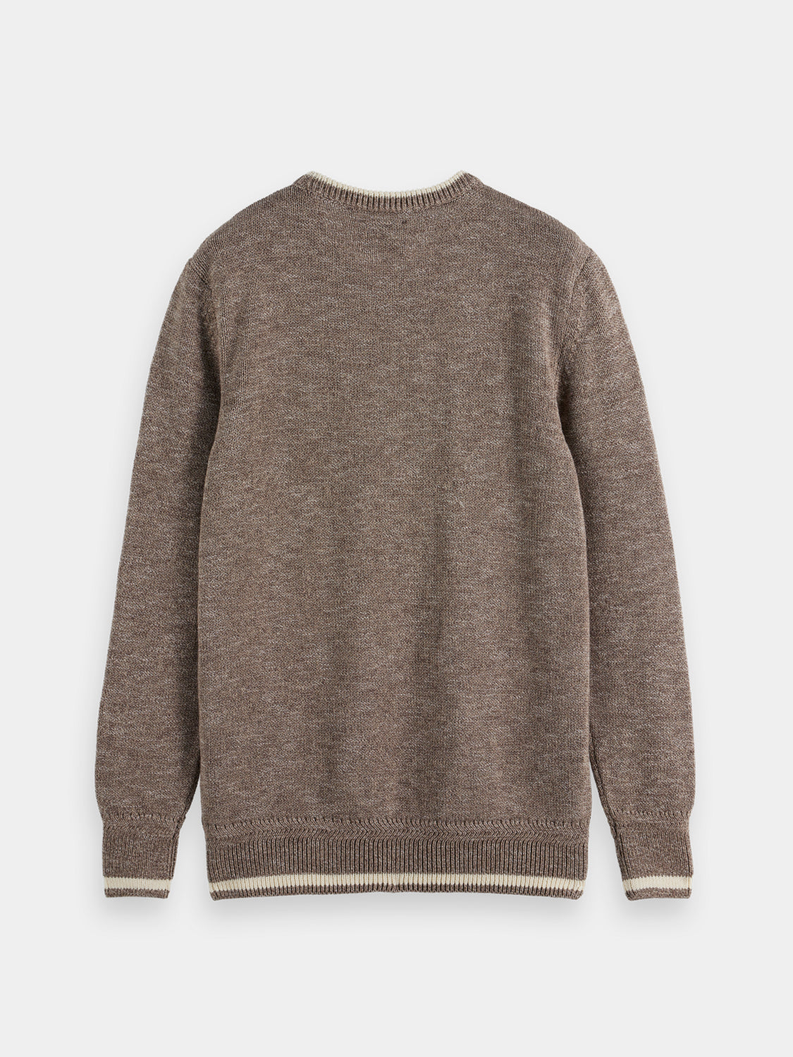 This pullover features a melange fabric that adds depth and character to the classic crewneck design. Detailed with rib knit cuffs and bottom, and a subtle stripe detail along the collar, bottom, and sleeves, it's a timeless piece for any occasion.
