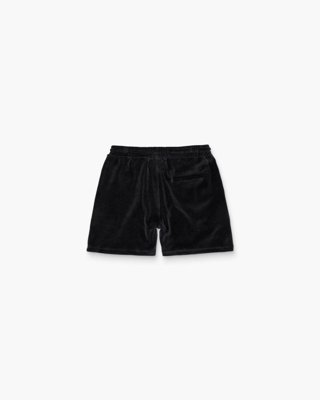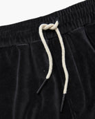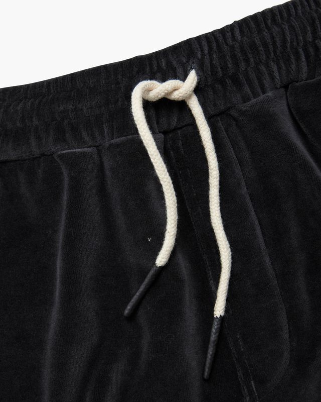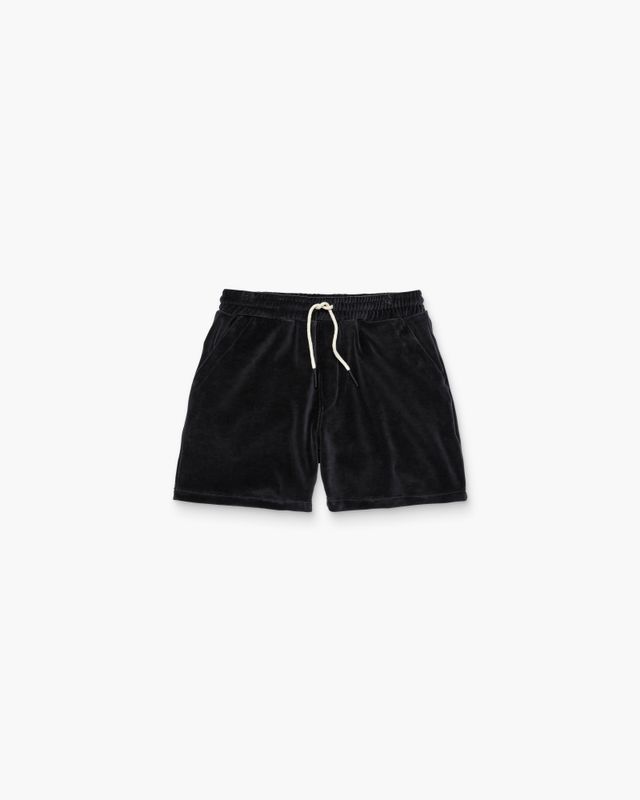 The Nearly Black velour shorts are distinguished by a supremely soft velour-knit fabric. Style details include a non-functional fly, an elasticized drawstring waistband, slanted side pockets and a welt pocket in the back.