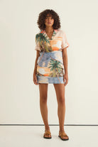 The Cool Tropics S/Shirt is a luxury linen shirt in signature tropical landscape print. Features include relaxed silhouette, tortoise shell buttons and short sleeve. Worn with the Cool Tropics Mini Skirt.