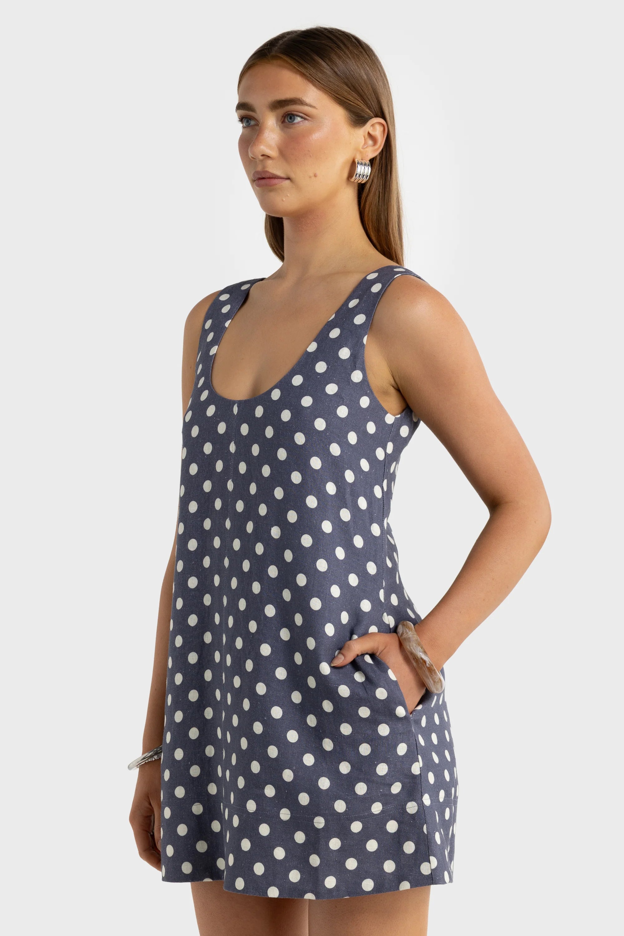 Nora Linen Mini Dress - Harbour Blue Polkadot
