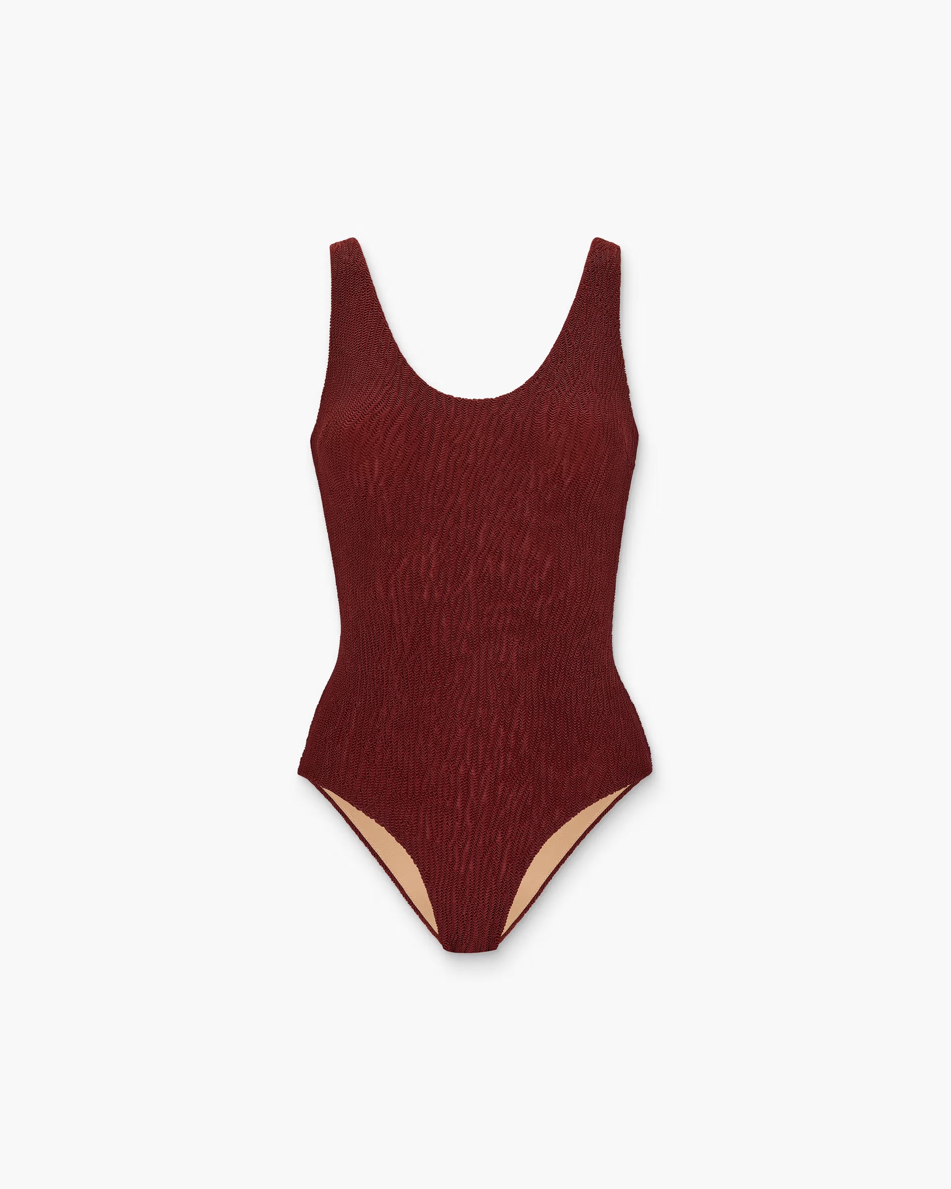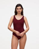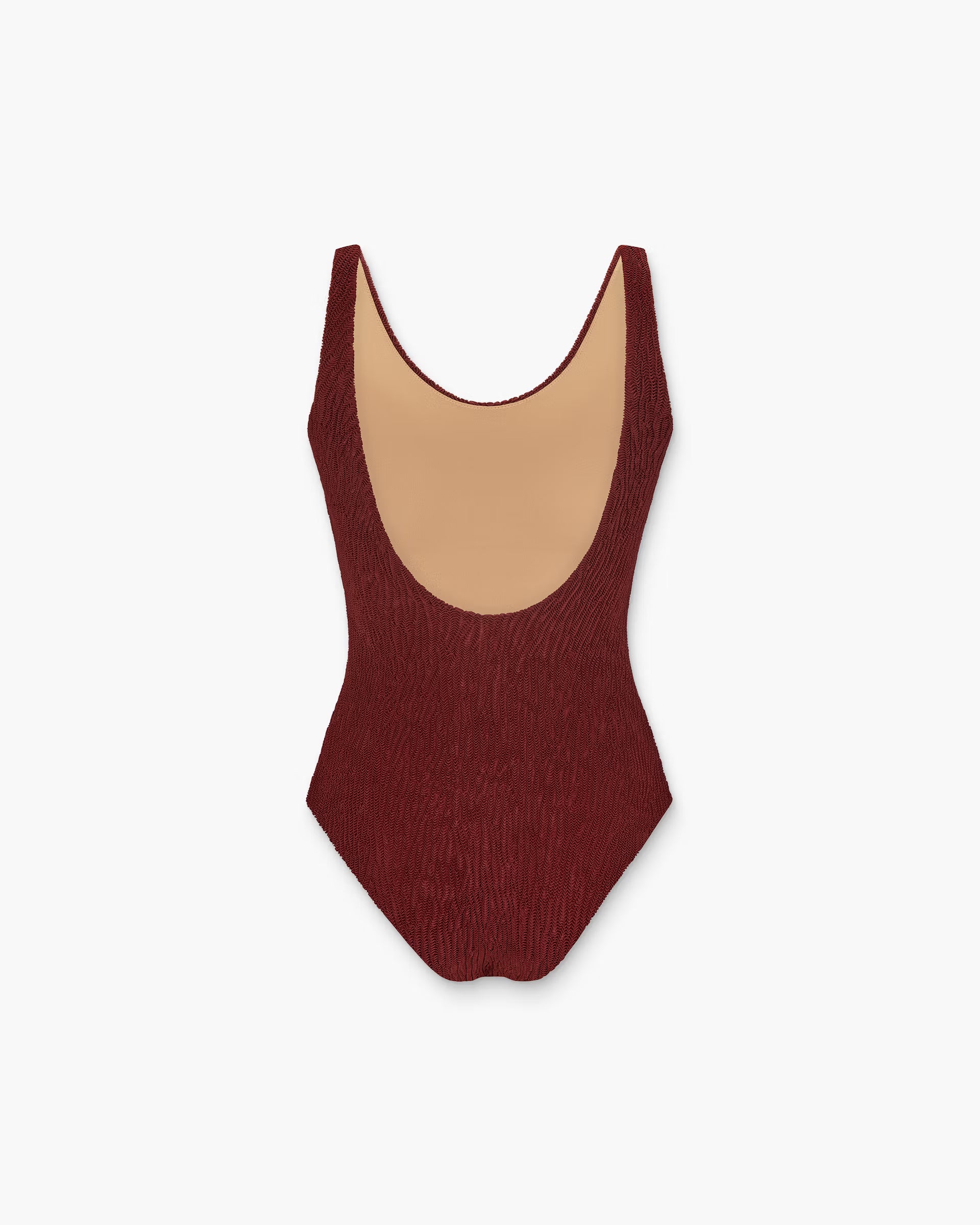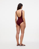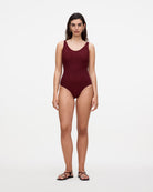 The Cherry Isola bathing suit is shaped to a timeless ballerina silhouette with a rounded neckline and deep back. Made from nylon featuring a structured surface emblematic of its seersucker weave. Fully lined.