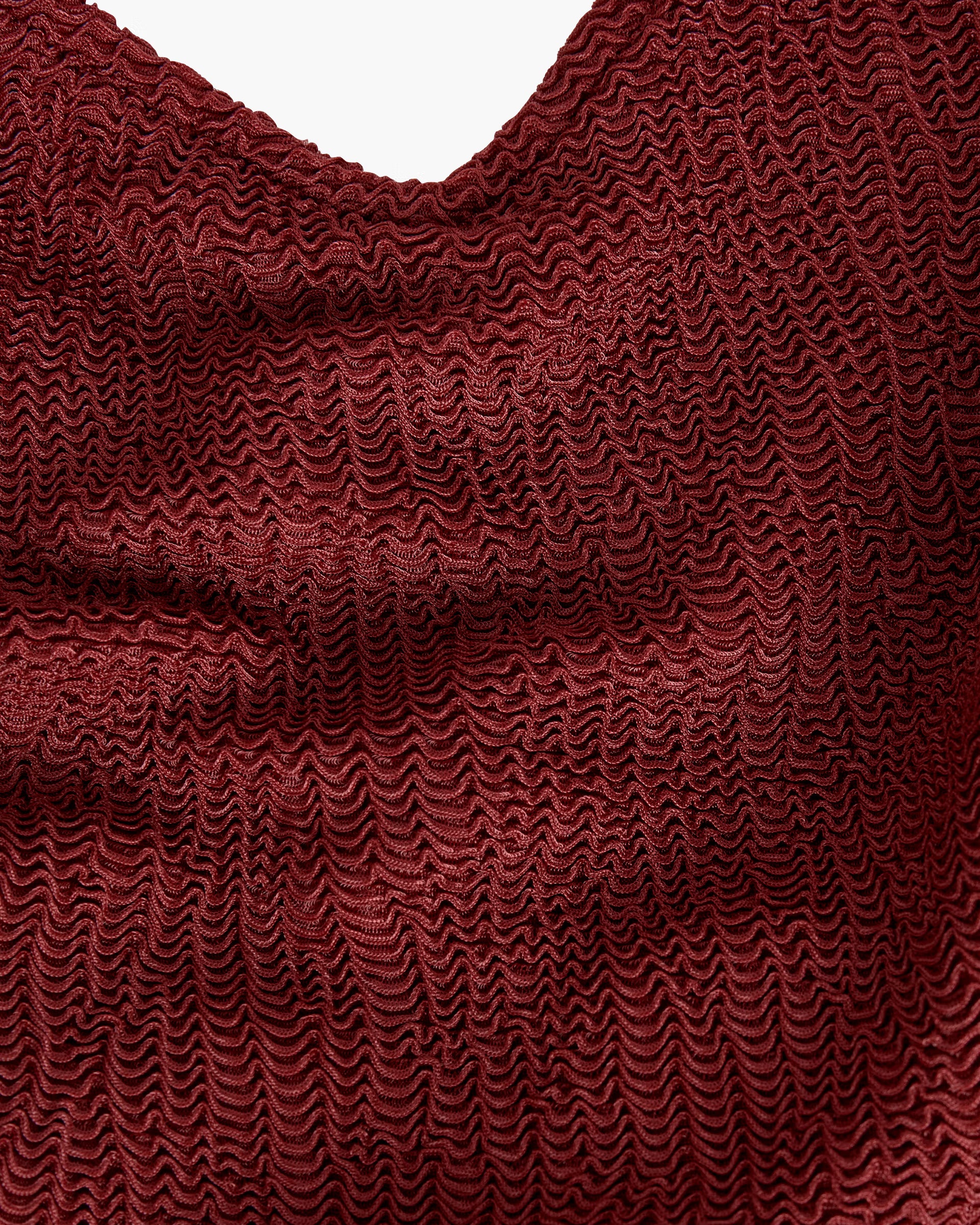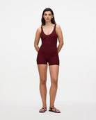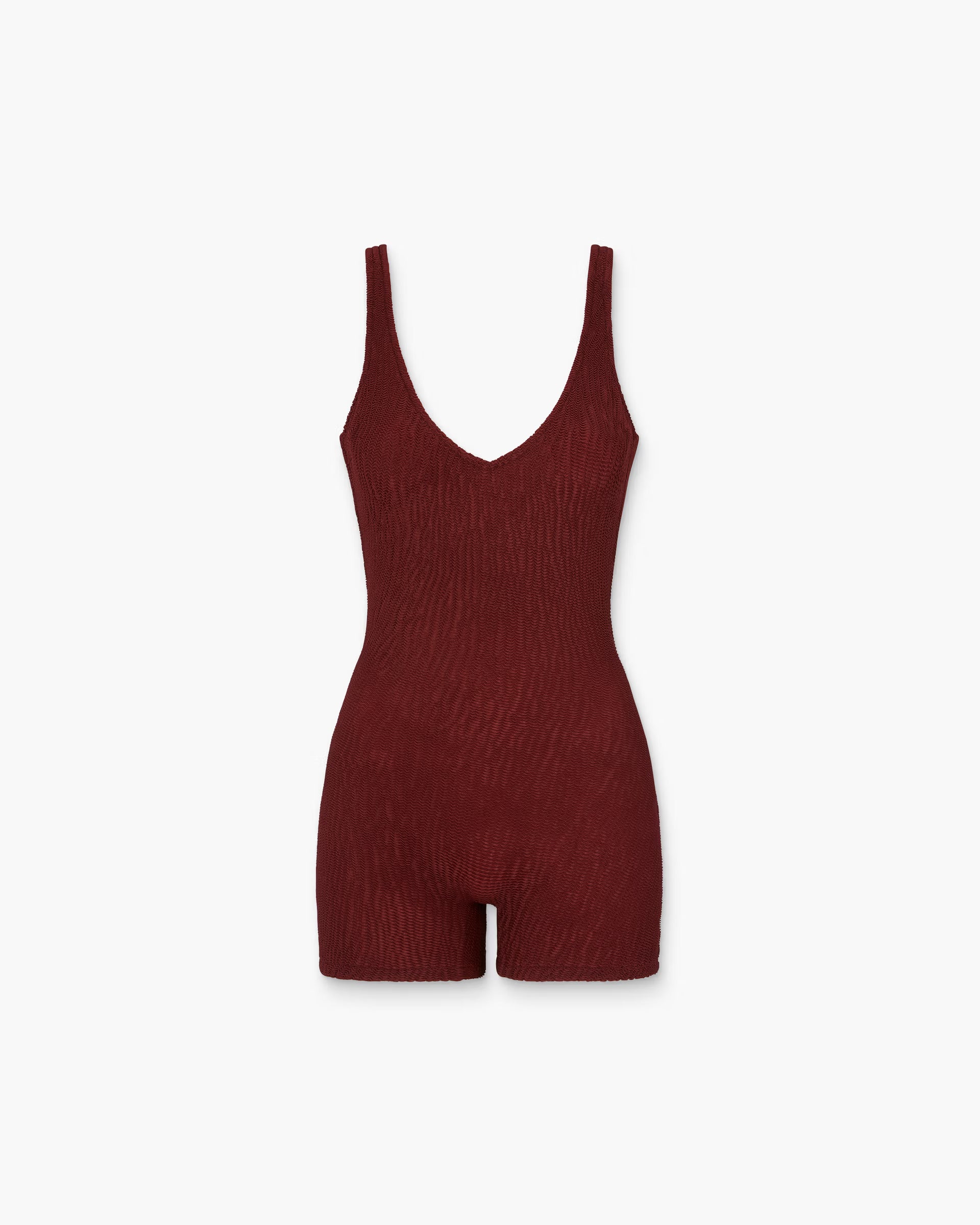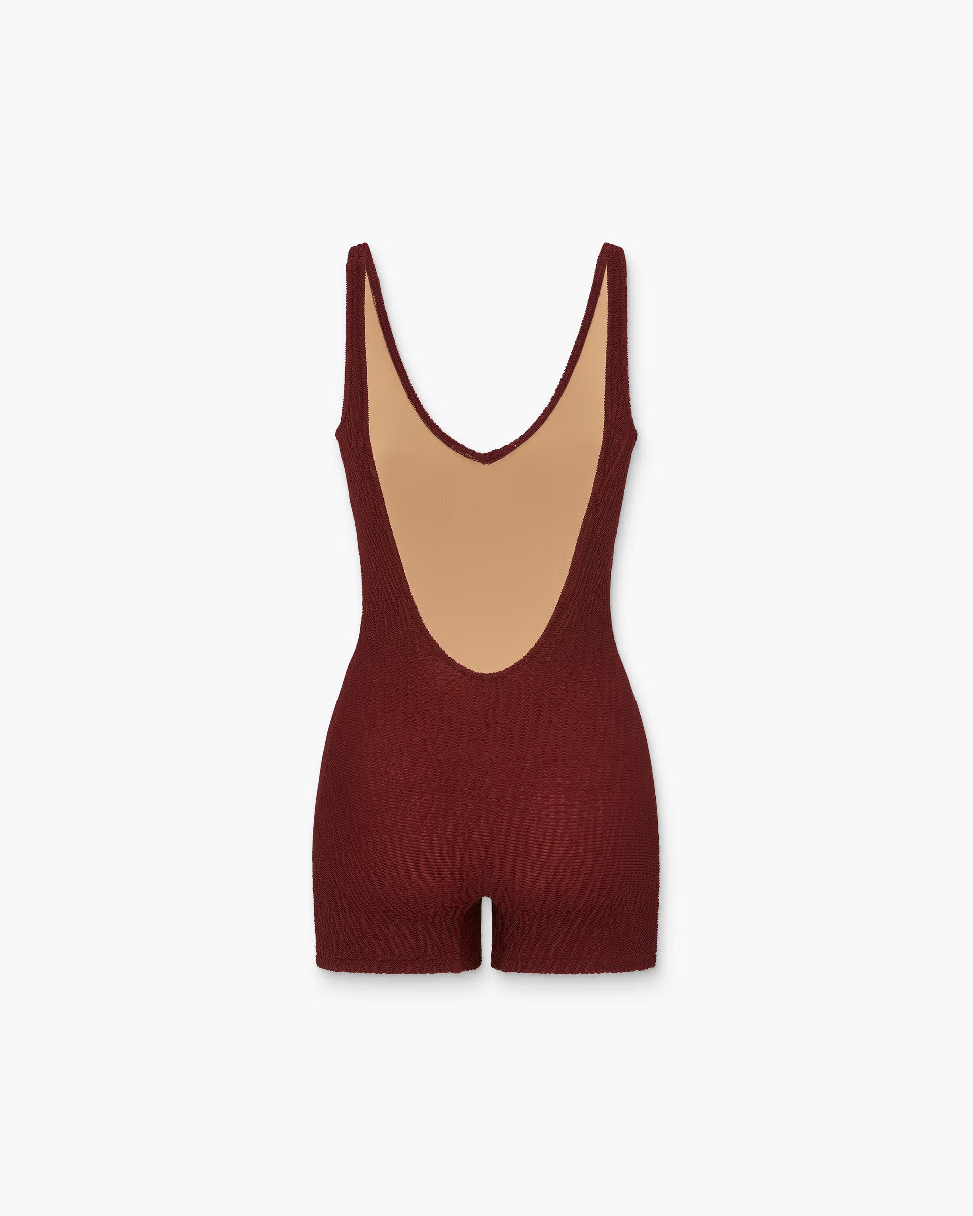 The Cherry Mar bathing suit is a catsuit-esque silhouette that hits at the mid-thigh, with a deep V-neck and open back. Made in a crinkled seersucker fabric that supports and flexes to the natural contours of the body. Fully lined for a smooth fit. Wear it alone or layer with your favorite blazer, shirt, or jacket.