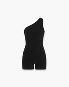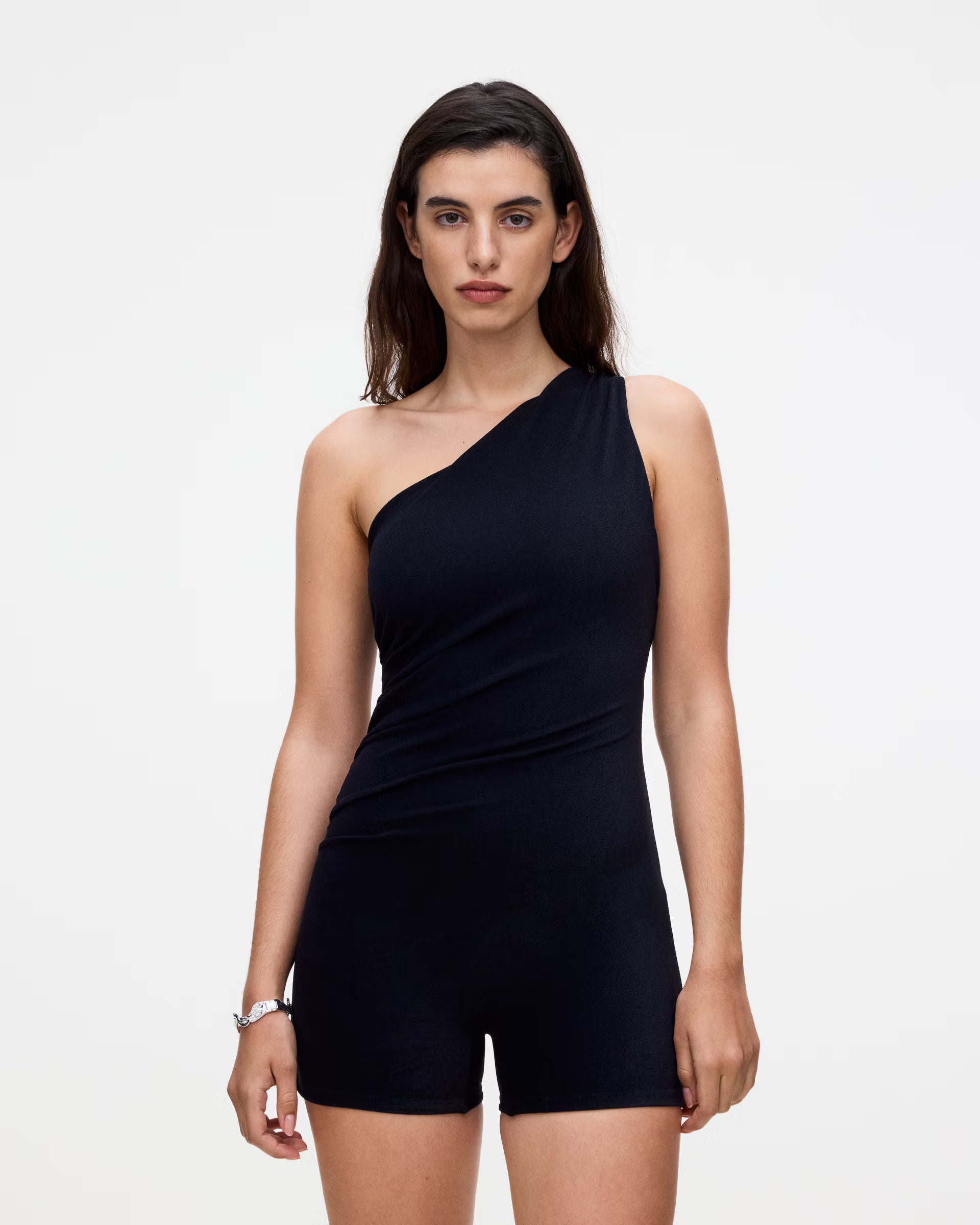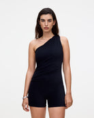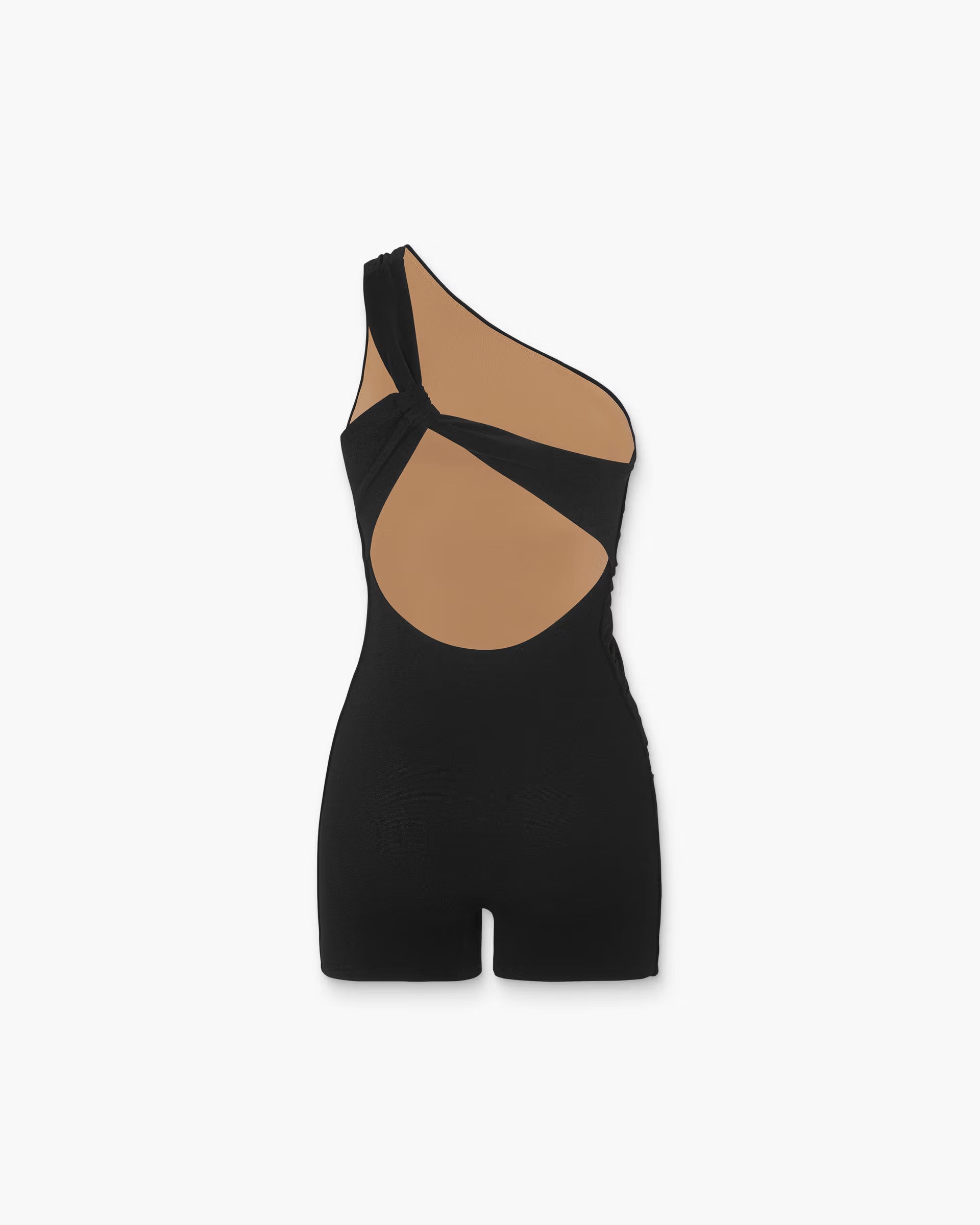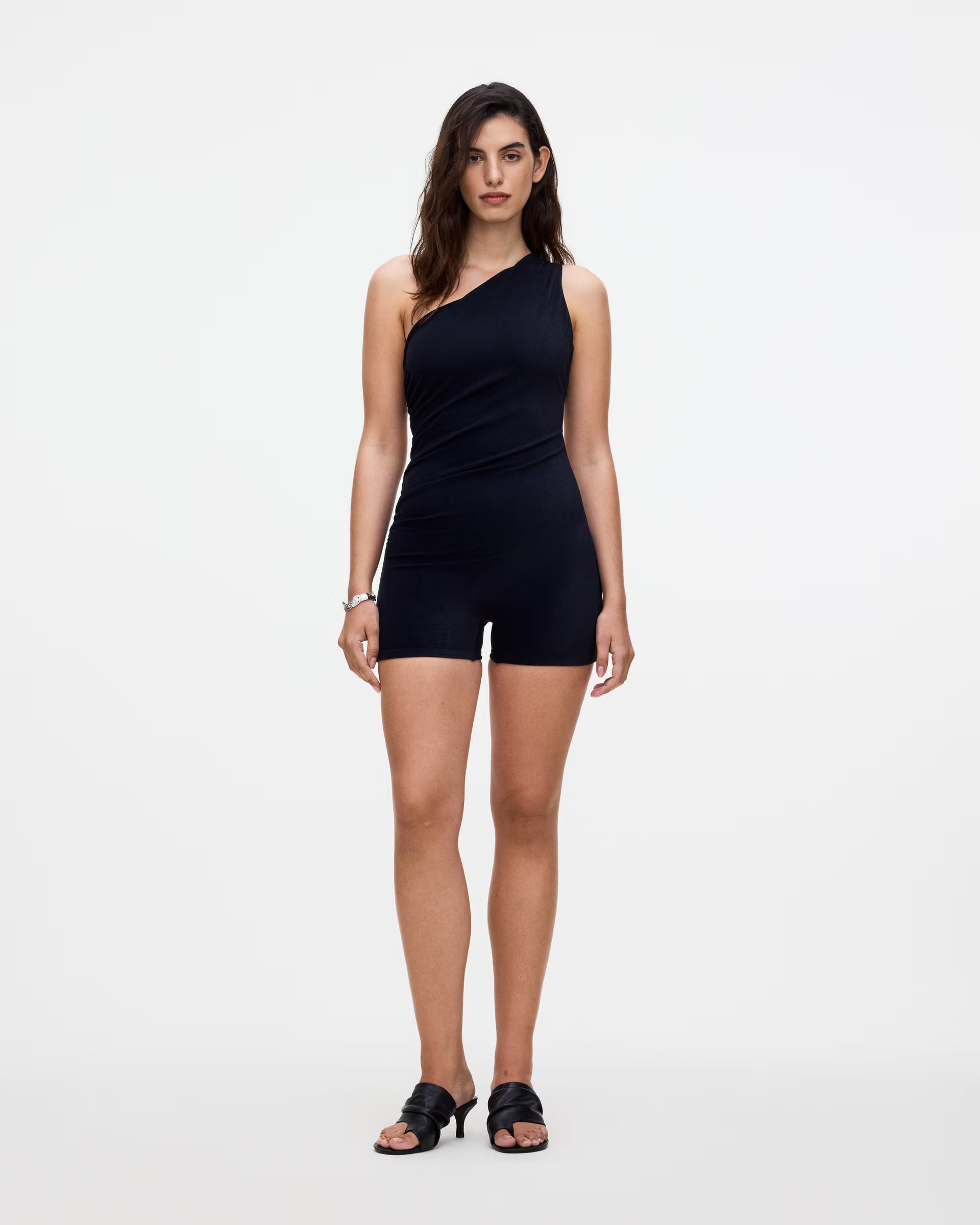 The Nero Uma bathing suit is a one-shoulder silhouette cut to hit mid-thigh, with ruched detailing accentuating the shoulder and waist. Made of swim terry, a textured fabric with a soft sheen, based on recycled nylon. Fully lined with invisible seams for a smooth, streamlined fit.