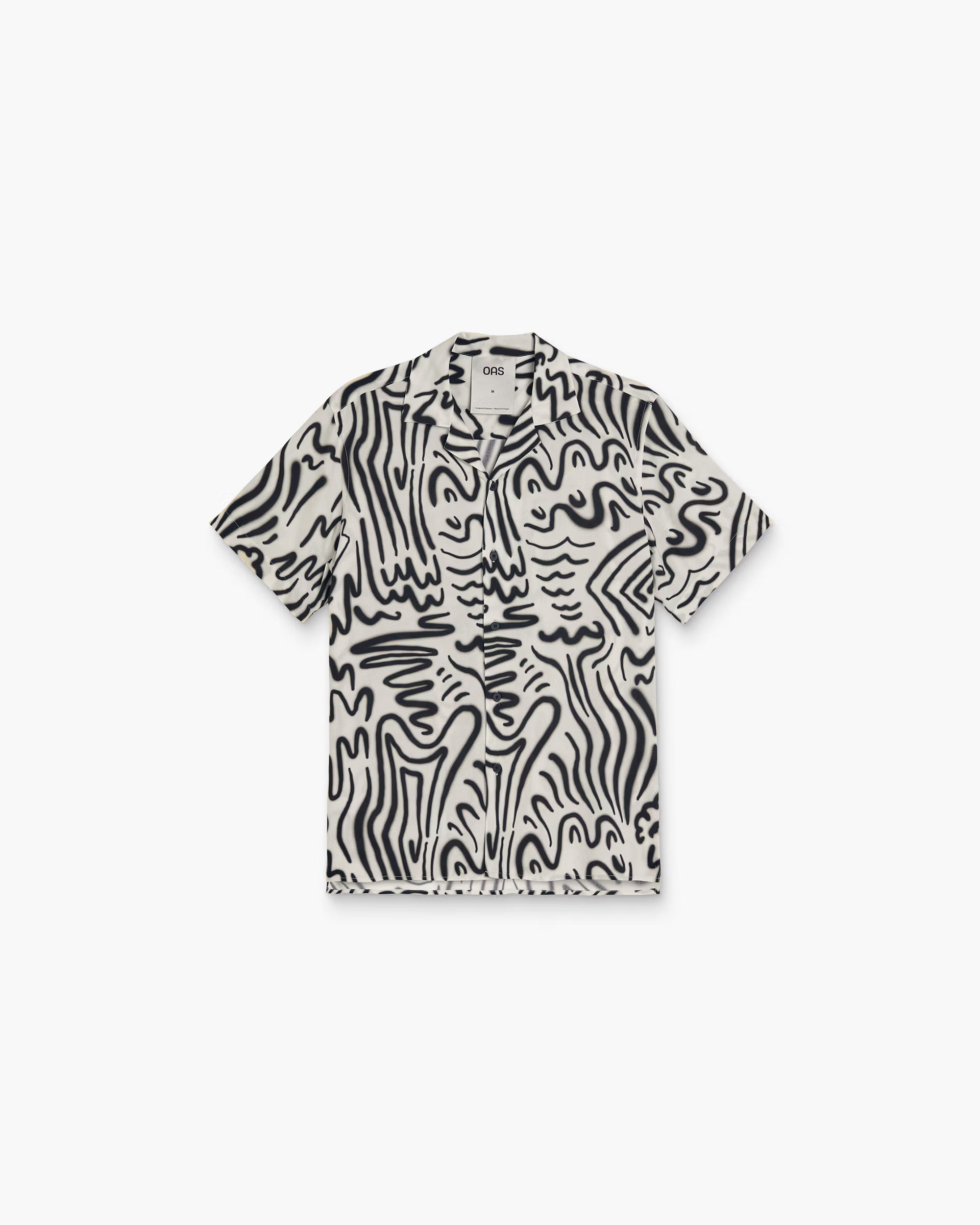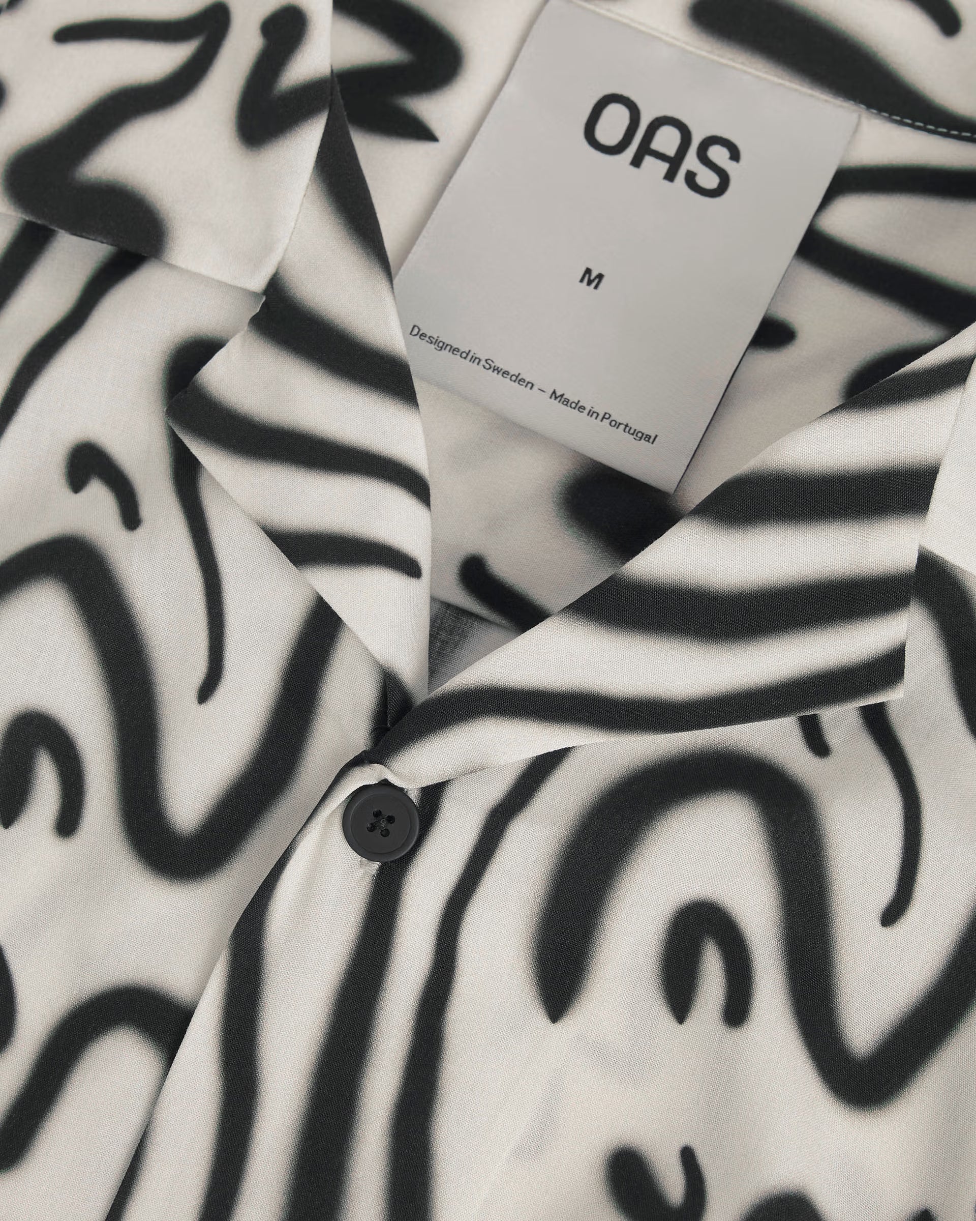 Black and white short-sleeved viscose shirt. Lightweight and breathable with a silky soft feel. Relaxed fit, slightly dropped shoulders.