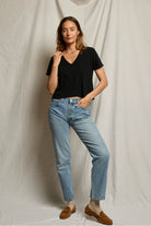 beckett is like your alanis tee’s cooler, boxier cousin. crafted in our crisp recycled cotton, it offers the same effortless v-neck silhouette with a more relaxed, structured body. the hem hits just right for tucking or letting it drape, and the lightweight feel makes it easy for everyday wear. minimal, modern, and intentionally simple.